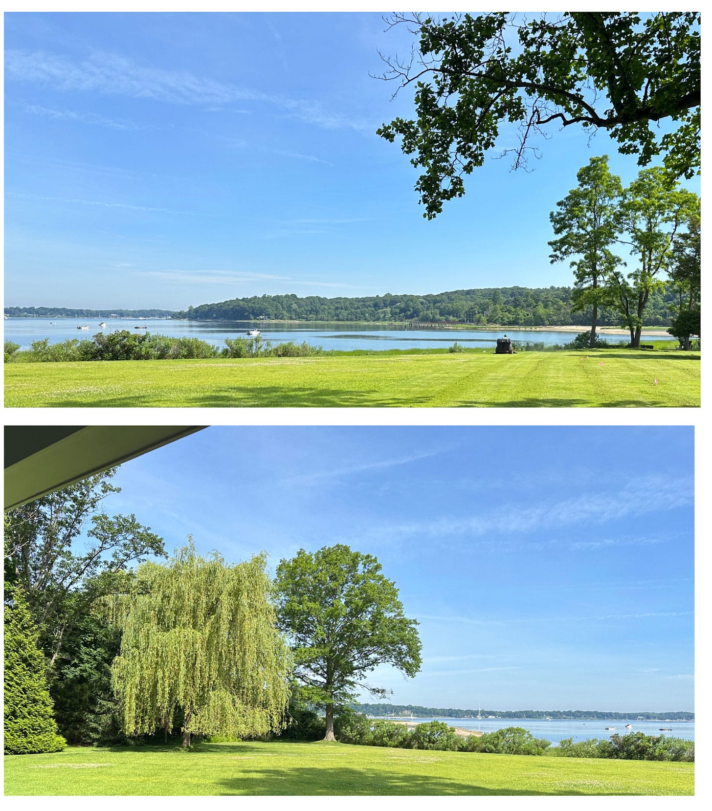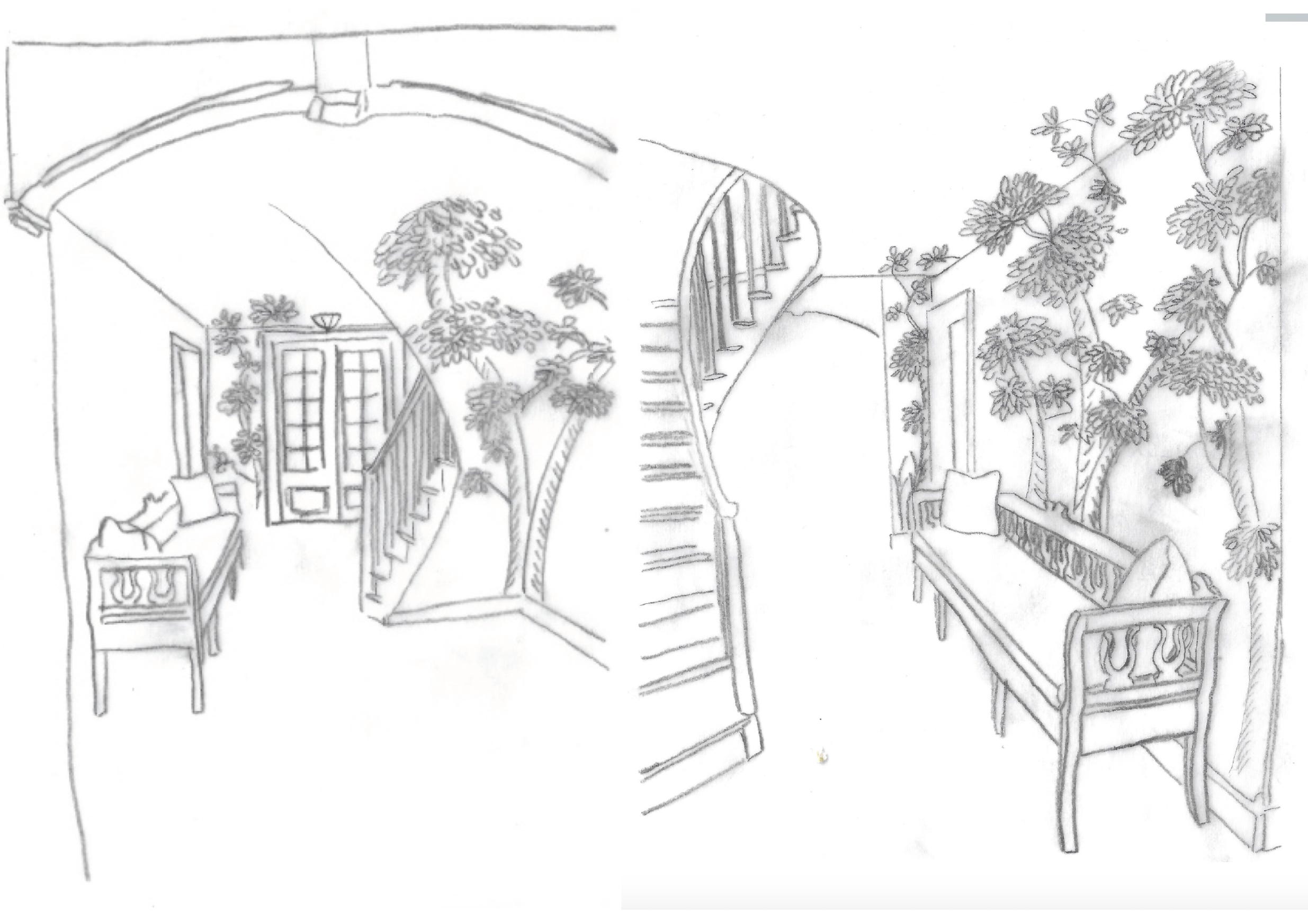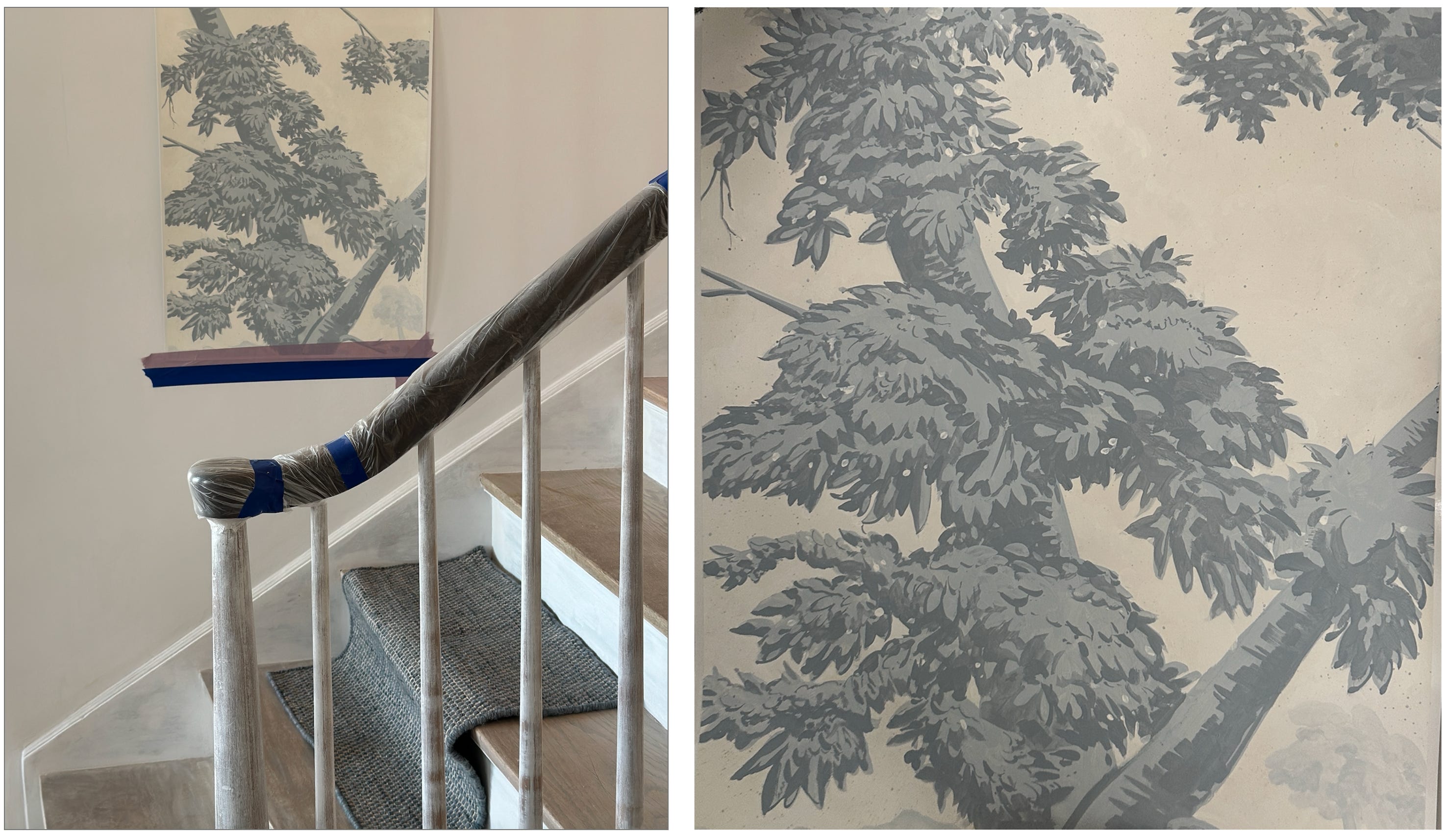 Because we wanted the ceilings to feel higher, we removed any additional design elements that would overcomplicate or crowd the space and draw the eye downward. We kept only the trees and painted them onto the ceiling to draw the eye up and make the ceiling feel taller. We also benefited from the fact that this part of the house is so old that there is too much movement in the ceilings for crown molding to sit flat, so we had nothing stopping us from bringing the trees up onto the ceiling.