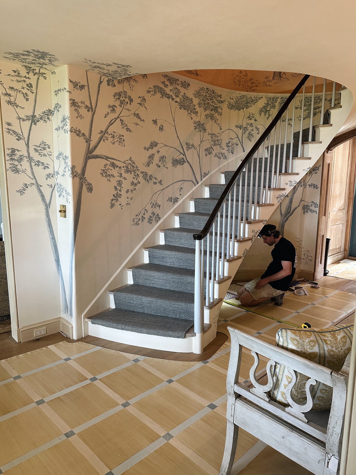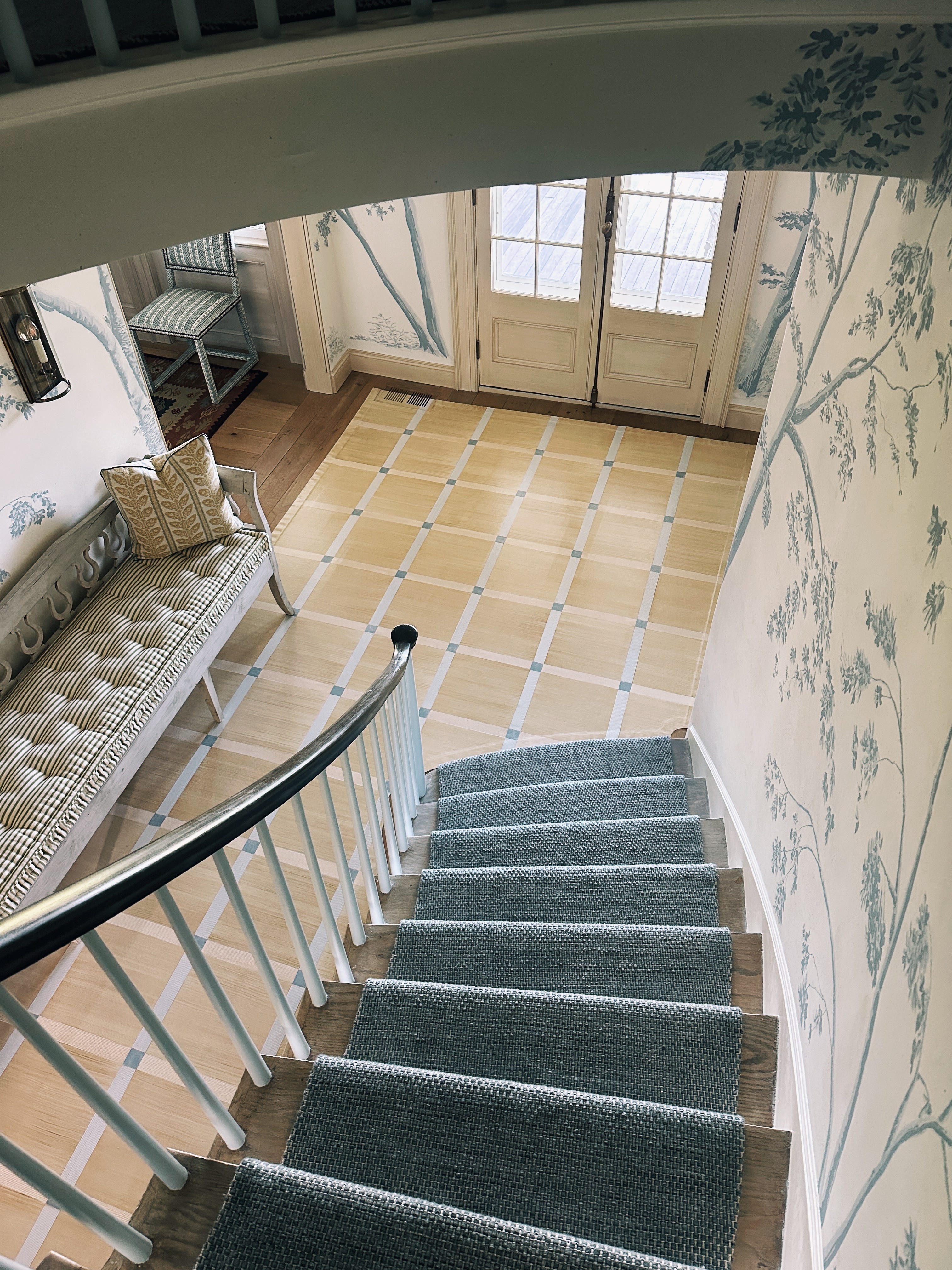 A: The runner is from Elizabeth Eakins. I wanted something that could withstand a lot of foot traffic, in a tonal version of the blues in the mural. I love a wool basketweave.