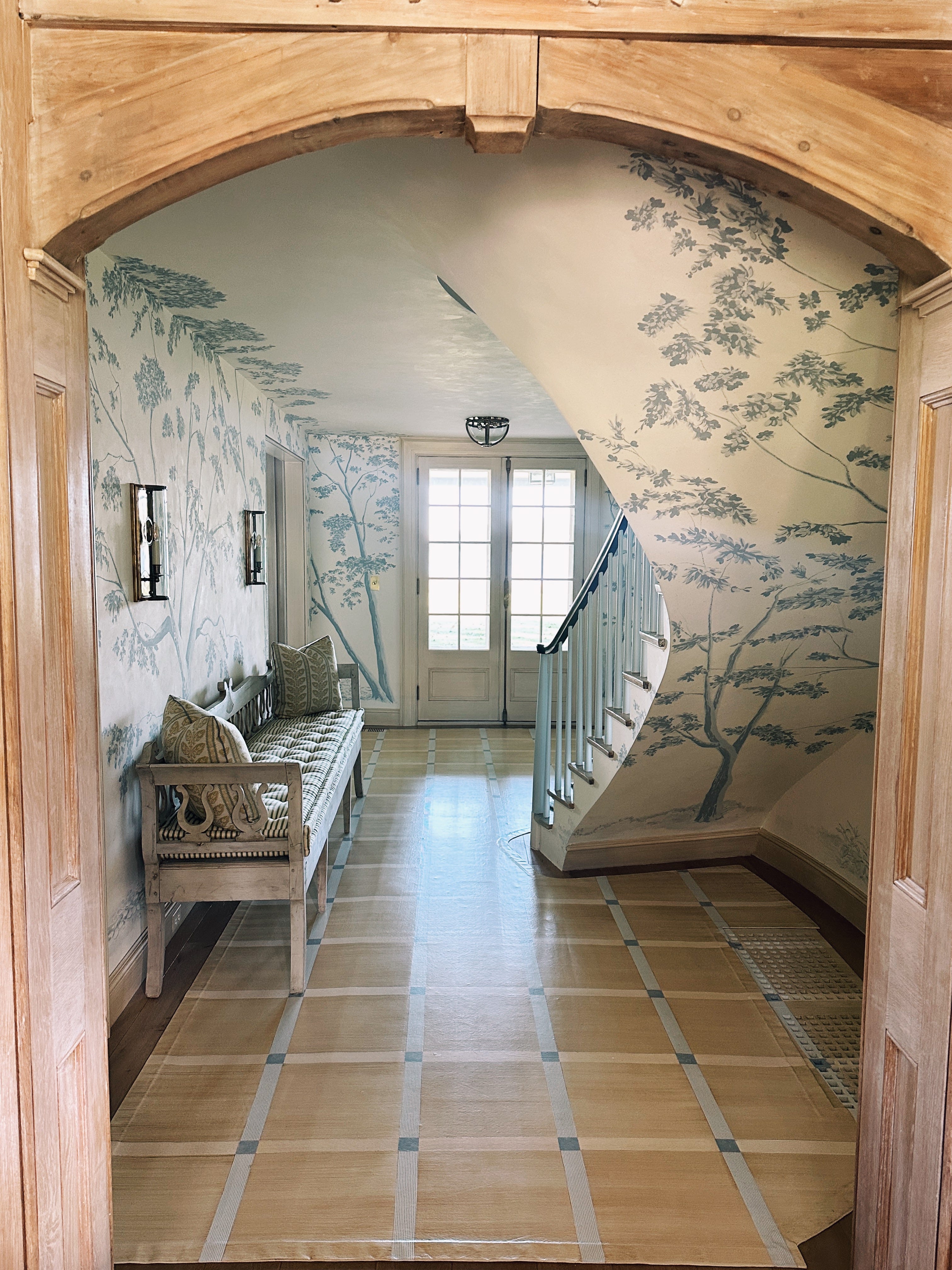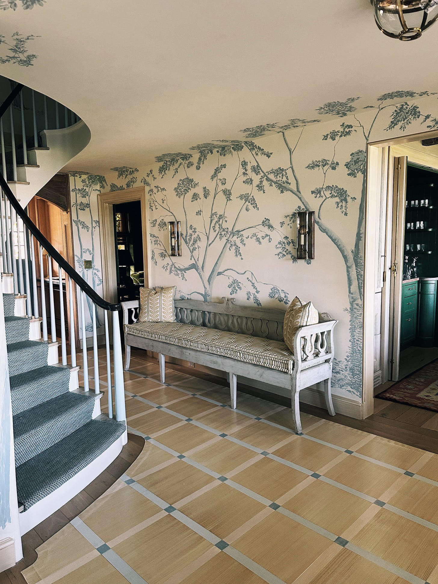 A: This is the entry hall of a historic home built in the mid-1700s, and it has more intimate proportions than the formal rooms of the house. My clients wanted the entry to make a statement while still feeling very inviting. I wanted to trick the eye into believing the space is larger than its actual footprint. One decorative way to achieve this is by using as much white space as possible within a pattern.