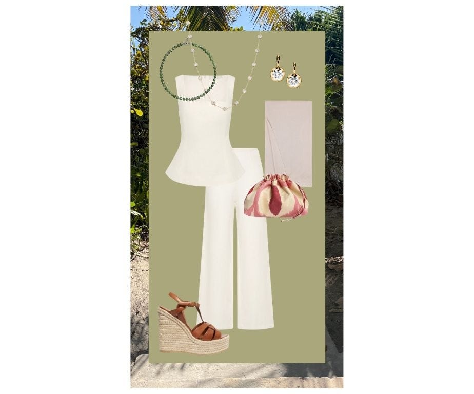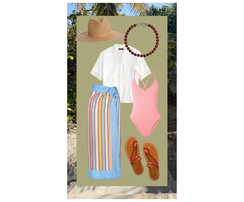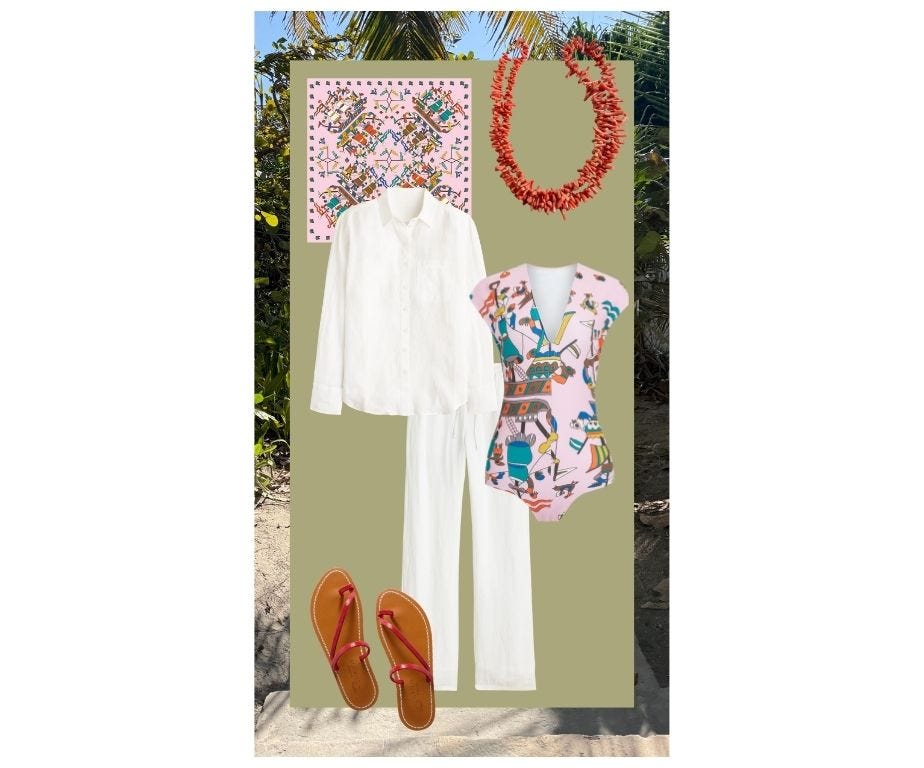 Nothing is formal, and all I need for the week is linen, a few bathing suits, and a handful of easy accessories. Some of the necklaces here are by Sophie Buhai and truly beautiful, but I also love semiprecious beaded necklaces found on Etsy (search for lapis, malachite, jade) and in souks and antique shops. I’m rewearing many pieces I already own, with a few additions I ordered online from my friend Elizabeth Tuke’s shop. This striped dress, a simple shift with a waist, and this chic bathing suit didn’t make the cut on the collages below but will get a lot of wear on this trip.
